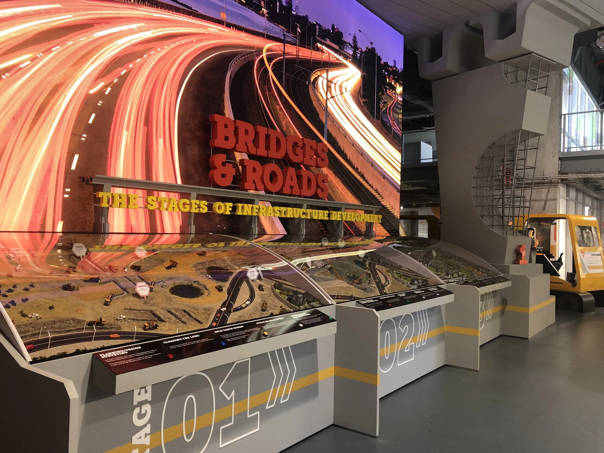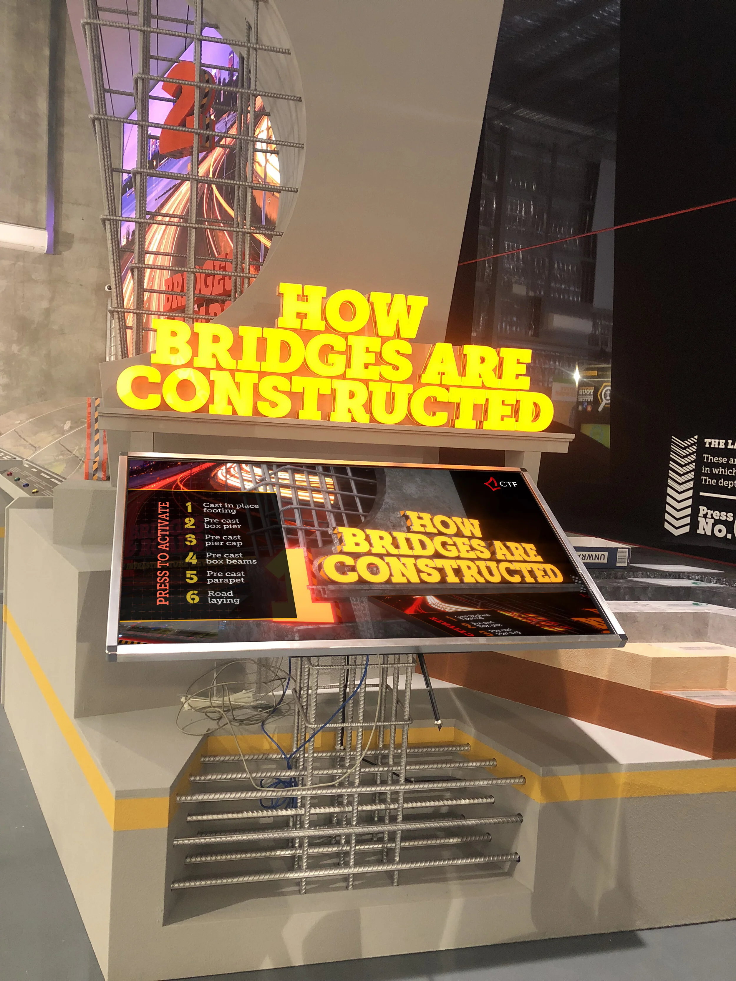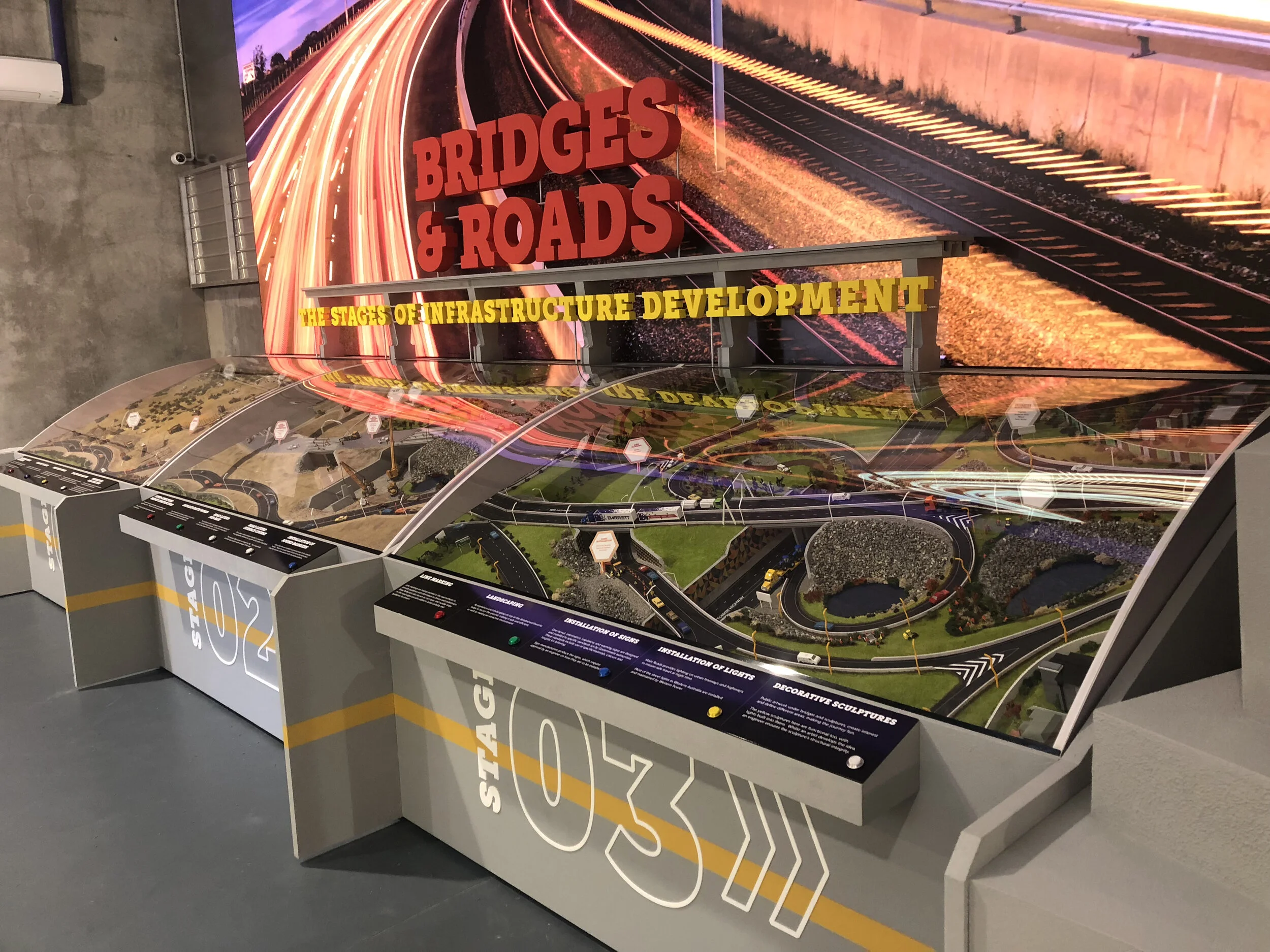 Barrett Exhibition Group engaged Walker Design to design two museum concepts. The Bridges and Roads installation here is the first of the two and was designed to teach the 12-17 yr old demographic what an education in Civil Construction would entail and ultimately would the job of a Civil Construction Engineer is. The below concepts were designed and visualised by Walker Design, the production was built and installed by Barrett Exhibition Group. As part of the concept design Walker Design also designed and animated an interactive touchscreen explaining how a typical fly-over bridge is constructed.