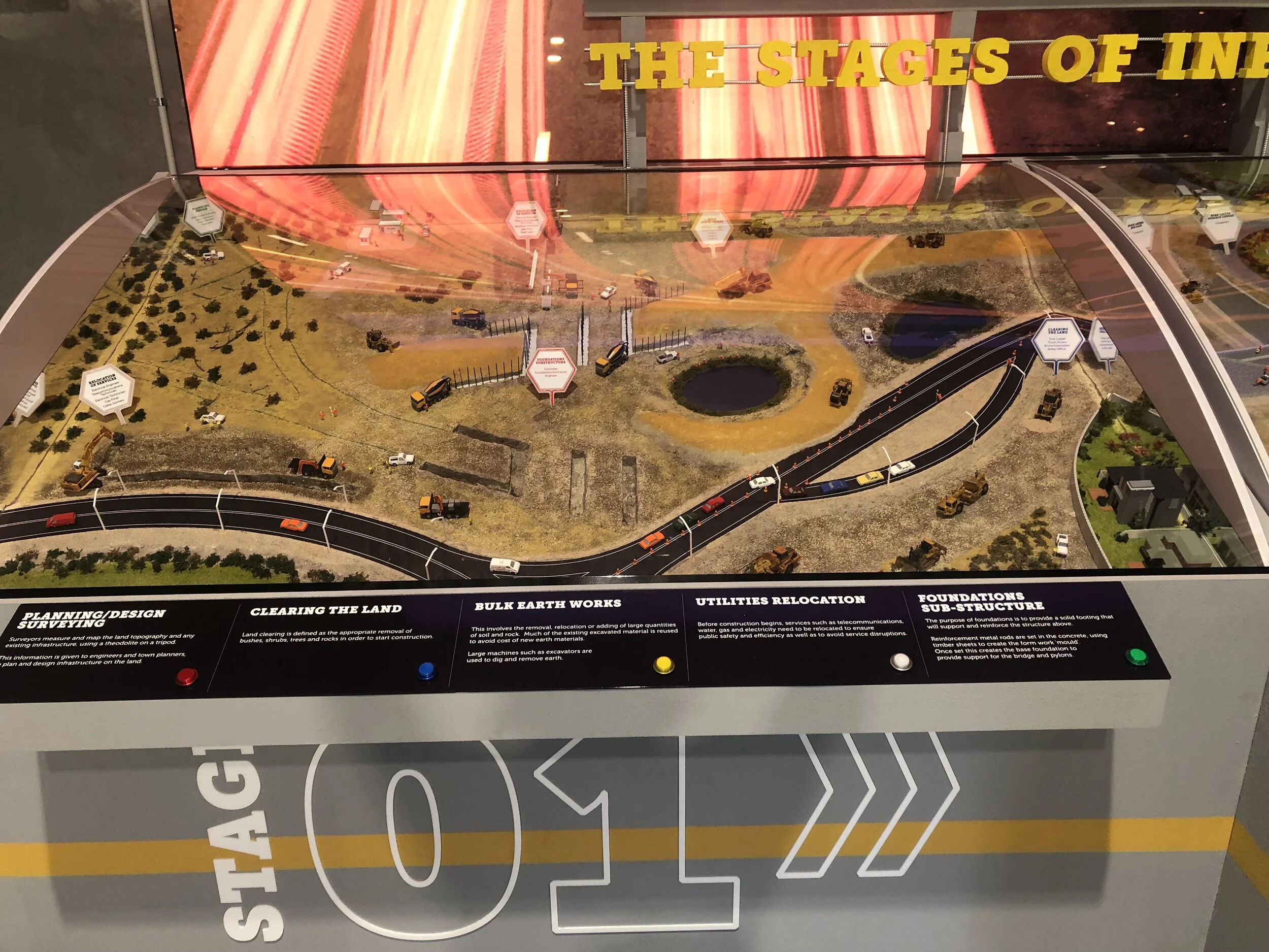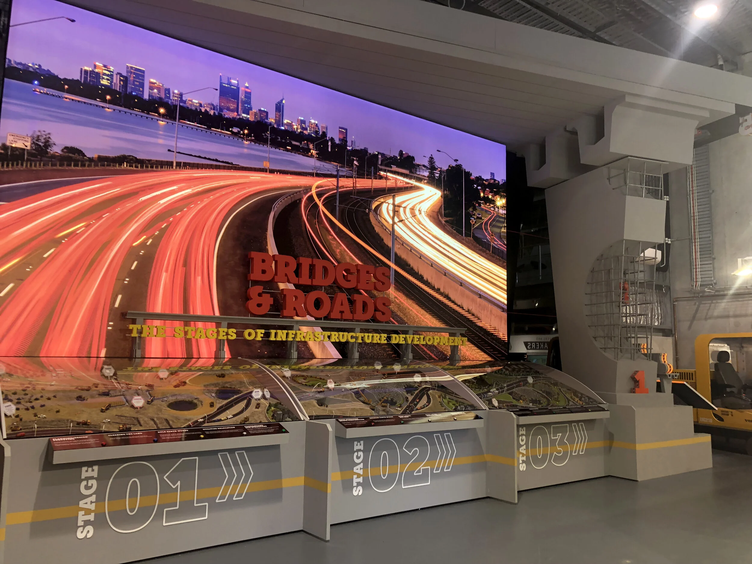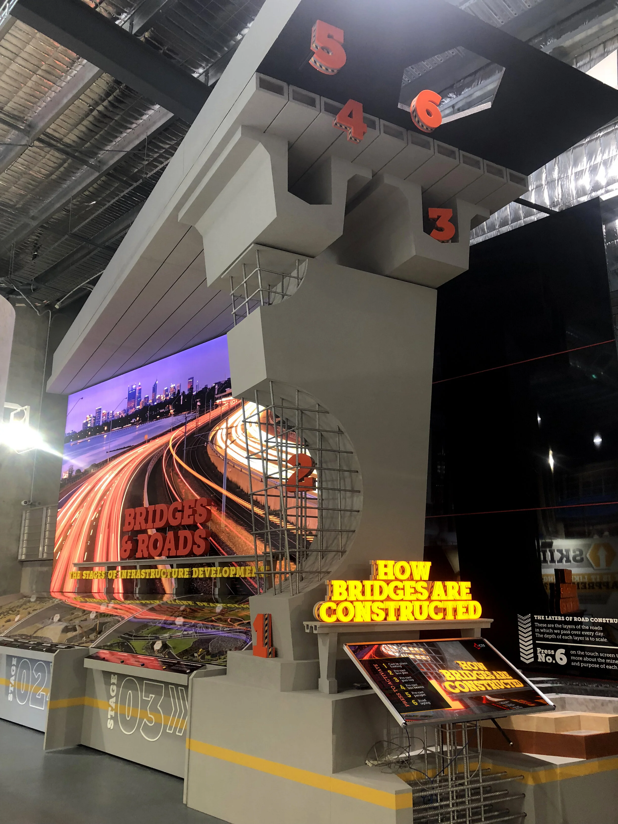 Barrett Exhibition Group engaged Walker Design to design two museum concepts. The Bridges and Roads installation here is the first of the two and was designed to teach the 12-17 yr old demographic what an education in Civil Construction would entail and ultimately would the job of a Civil Construction Engineer is. The below concepts were designed and visualised by Walker Design, the production was built and installed by Barrett Exhibition Group. As part of the concept design Walker Design also designed and animated an interactive touchscreen explaining how a typical fly-over bridge is constructed.